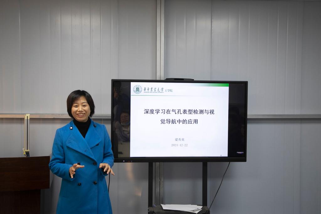 “植物表型是植科院学生们展开科学研究的基础,然而目前植物的表型全部都是用人工来测的,往往需要花费大量的时间。如何缩短植物表型检测的时间呢?如何实现自动化的检测呢?”梁秀英老师以这样的一个问题开场,激起了在场同学们的思考。随后,她介绍了深度学习在“植物气孔表型检测”“视觉导航”“香菇棒分级”等领域的应用情况。