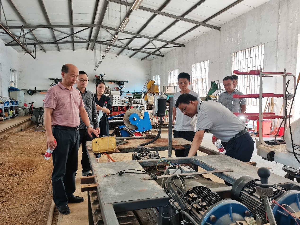 王爱民一行首先前往我校工科基地参观了荸荠挖掘机、莲藕挖掘机、菱角分级脱壳机、再生稻收获机、水稻精量直播机等我校自主研制的水生蔬菜、水稻生产机械化装备。随后,团队执行人周勇汇报了团队组成、研究方向、近期主要创新成果和科技服务等情况。