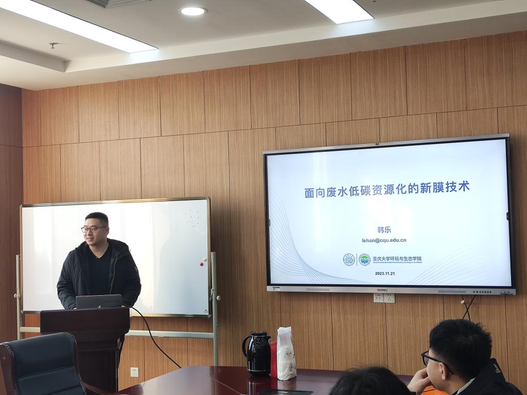 11月21日上午,重庆大学环境与生态学院环境工程系韩乐教授做客我院精工讲坛,以“面向废水低碳资源化的新膜技术”为题在新工科楼G320开展学术交流报告,近90名师生参加,会议由我院贺清尧副教授主持。