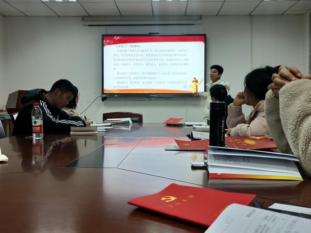 王岩同志在领学《加强和改进“三全育人”工作实施意见》时提到“三全育人”即全员育人、全程育人、全方位育人。他特别分享到我校召开的12月基层党组织书记例会暨“三全育人”工作推进会的四点要求:一是要落实主责,务实重行;二是要深学真信、力行见效;三是要三全育人、守正创新;四是要全面盘点、系统谋划。