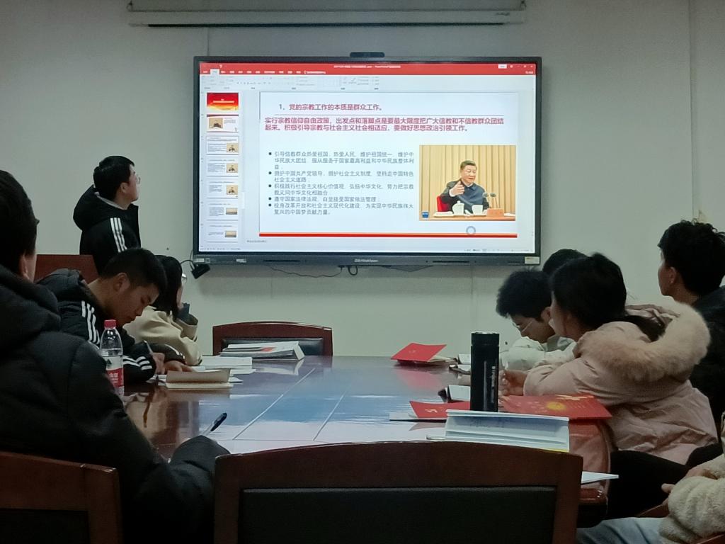 邹志东同志领学习近平总书记在全国宗教工作会议上讲话精神。他指出党的宗教工作的本质是群众工作,要积极引导宗教与社会主义社会相适应,要坚持以“导”的态度对待宗教,提高宗教事务治理法治化水平、培养好“三支队伍”、提高宗教界自我管理水平。