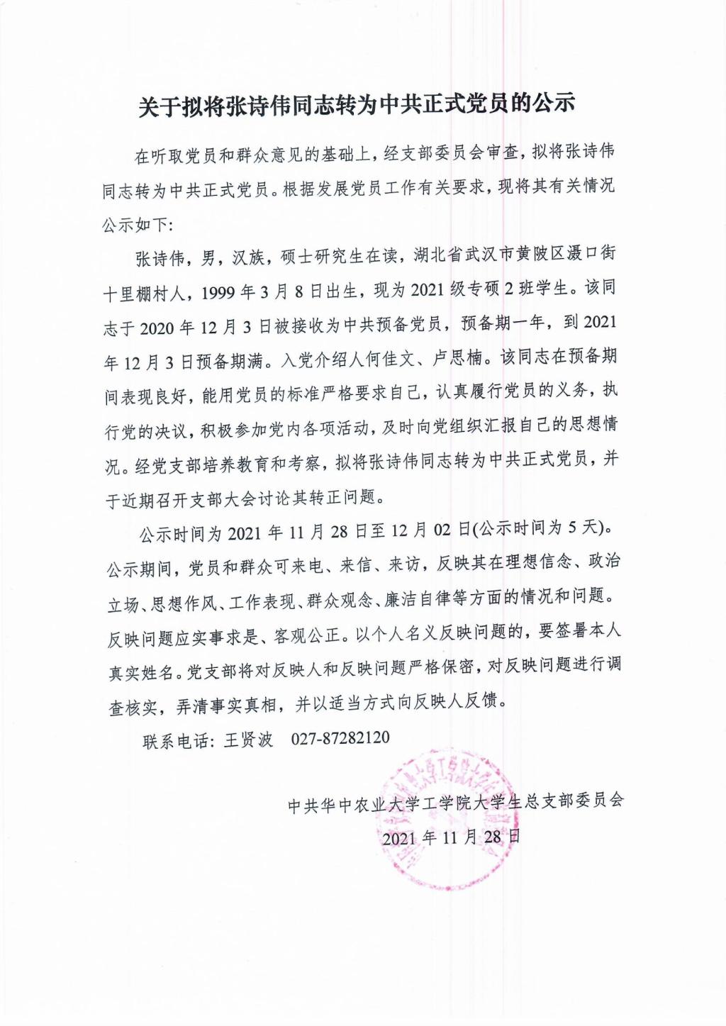 【研】关于拟将张诗伟同志转为中共正式党员的公示