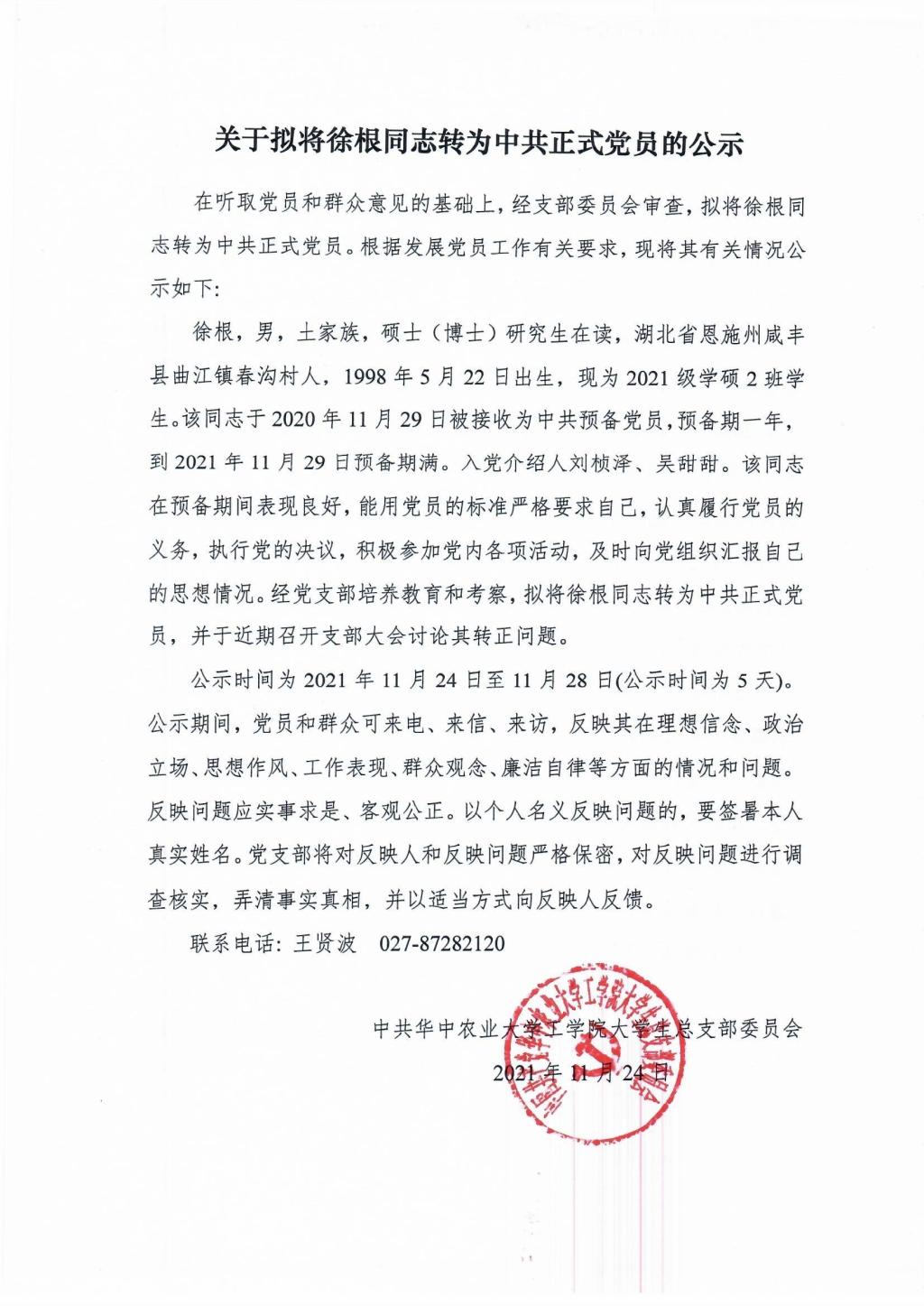 【研】关于拟将徐根同志转为中共正式党员的公示