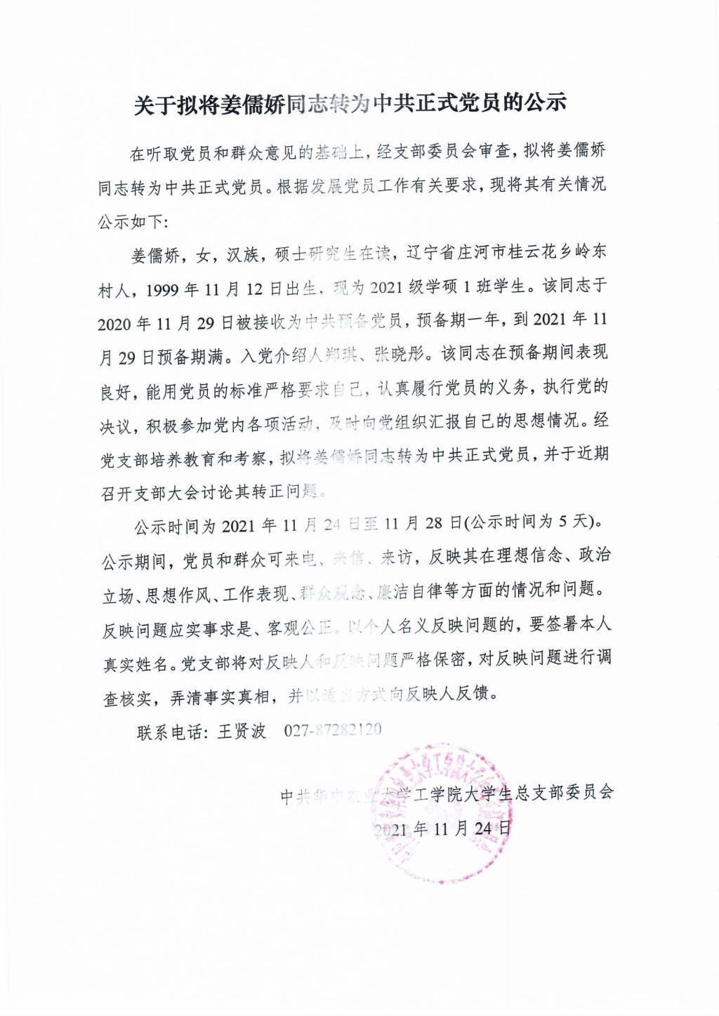 【研】关于拟将姜儒娇同志转为中共正式党员的公示