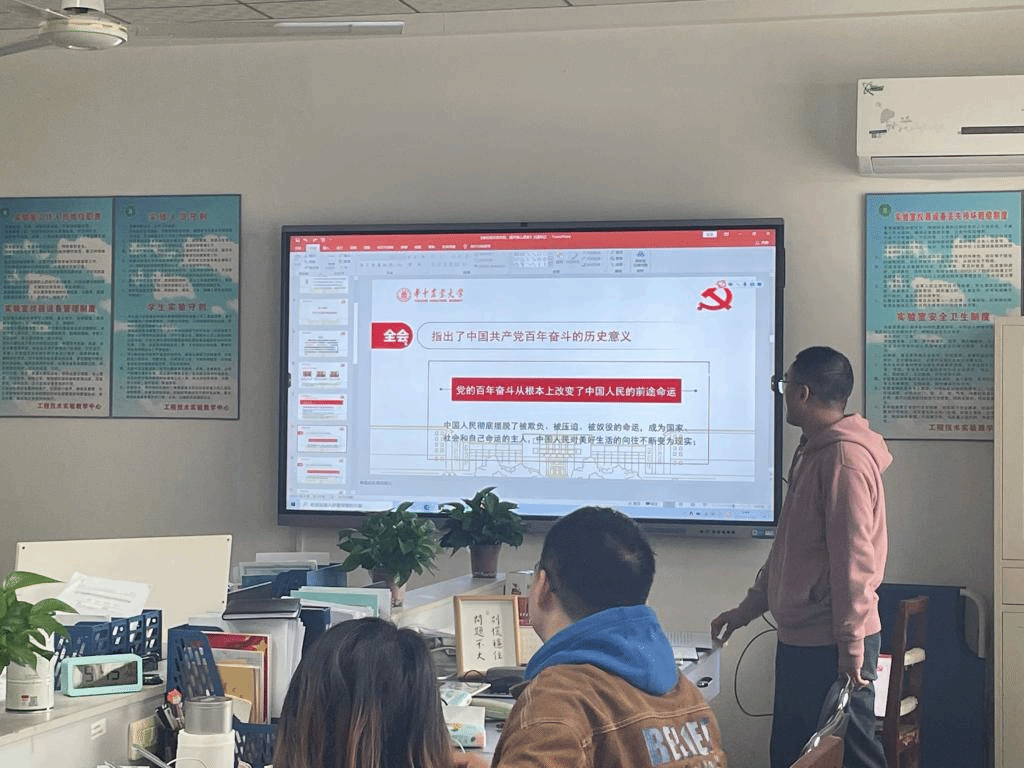 会议开始,党支部书记杨天圆带领支部同志学习党的十九届六中全会精神,通过对该会议的简单介绍,引出召开背景、一系列重要决议以及重要意义。同时重点带领支部同志回顾党的百年奋斗征程以及取得的历史经验,他指出,我们作为党的新生力量,要谨记我们入党时候的初心,要以初心指引我们的行动,指导我们的研究与学习。接着,杨天圆同志谈到,我们要大力弘扬伟大的党建精神,勿忘过去的磨难和成就,无愧于今天的使命与担当,不负明天的伟大梦想,要做到以史为鉴,开创未来,奋力拼搏,为实现党的第二个百年奋斗目标贡献自己的力量,为实现中华民族的伟大复兴的中国梦而不懈奋斗。