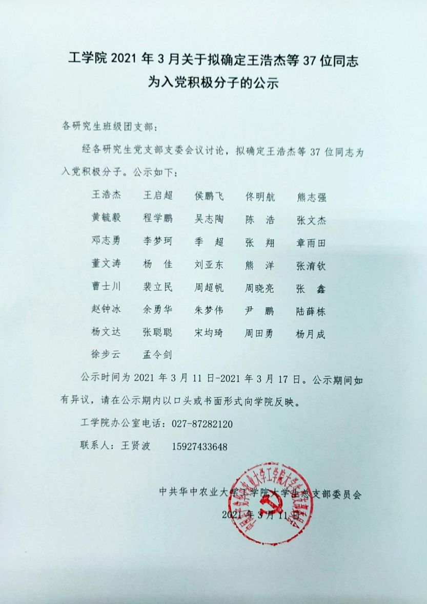 【研究生事务】英国365集团公司2021年3月关于拟确定王浩杰等37位同志为入党积极分子的公示