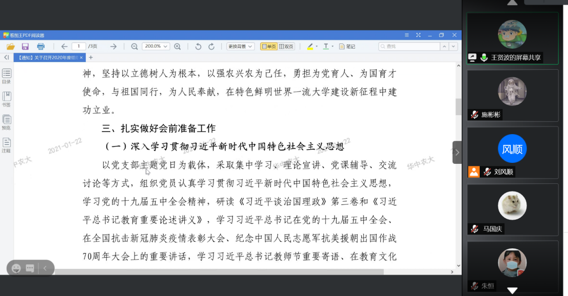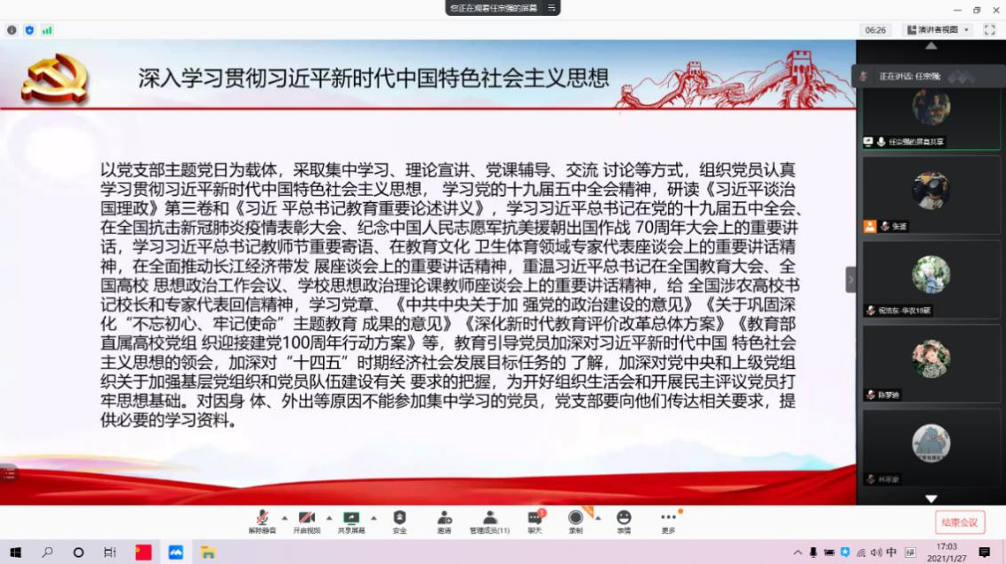 1月28日12点30分,农业生物环境与能源工程第一党支部在腾讯会议app线上展开了“学习新思想,勇乘新担当”专题学习会议,全体成员参加了此次会议。