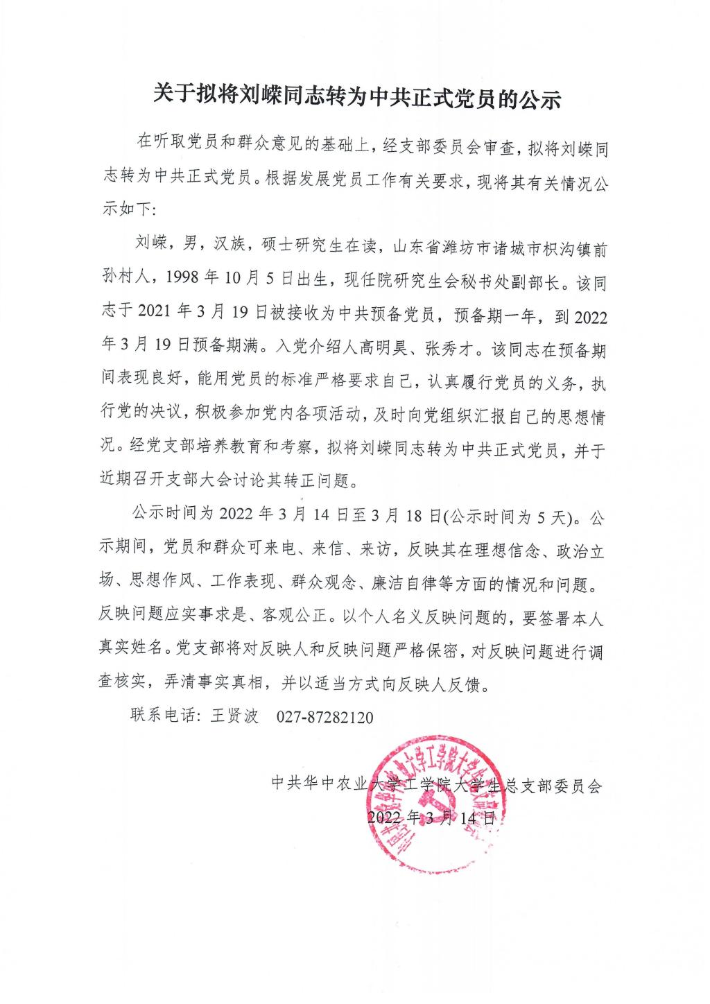 【研】关于拟将刘嵘同志转为中共正式党员的公示