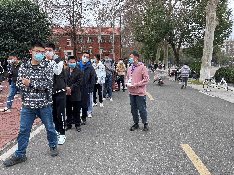 “请大家带好口罩,有序排队,提前打开‘武汉战役’小程序。”现任研究生党支部书记杨天圆在核酸检测现场负责秩序引导,志愿工作结束后,他分享到:“疫情防控关乎全校师生的安全和健康,能够在这个特殊的时期为校园疫情防控贡献一份自己的力量,我感到很荣幸。”其他志愿者也纷纷表示,虽然志愿服务的过程很辛苦很单调,但是想着自己是在助力疫情防控,为师生服务,就觉得一切都是值得的。