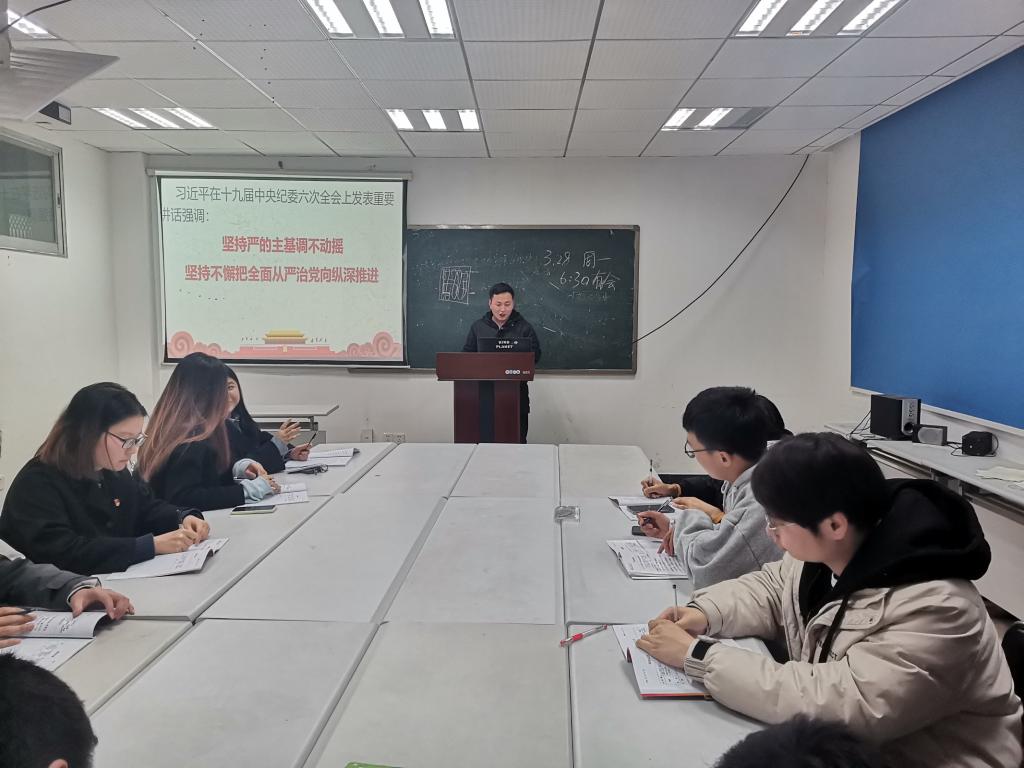 会上,李庆旭同志领学习近平总书记在十九届中央纪委六次全体会议上发表的重要讲话精神时谈到,我们要坚持严的主基调不动摇,坚持不懈把全面从严治党向纵深推进,虽然我们支部人数不够多,力量可能也不够强大,但是我们依然有我们的坚守,全面从严治党关乎国家兴亡,这是我们党一直在做的事情,我们研究生党员能做的便是不断提高对自己的要求,互相监督,共同进步。