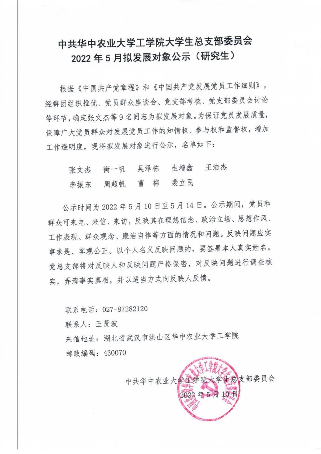 【研】中共英国365集团公司大学生总支部委员会2022年5月拟发展对象公示(研究生)