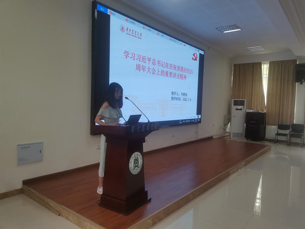 畜禽水产工程技术与装备研究生第二党支部书记岑晓旭在领学习近平总书记在庆祝香港回归25周年大会上的重要讲话精神时,先以从香港被分割出祖国直到回归祖国怀抱的一段历史事实回顾过去,又以香港回归后在党和国家的领导下良好的发展肯定了“一国两制”方针的重要历史意义。接着她又对未来提出希望,并说道:“青年兴,则香港兴;青年发展,则香港发展;青年有未来,则香港有未来。我们殷切希望,每一个香港青年都投身到建设美好香港的行列中来,用火热的青春书写精彩的人生。”