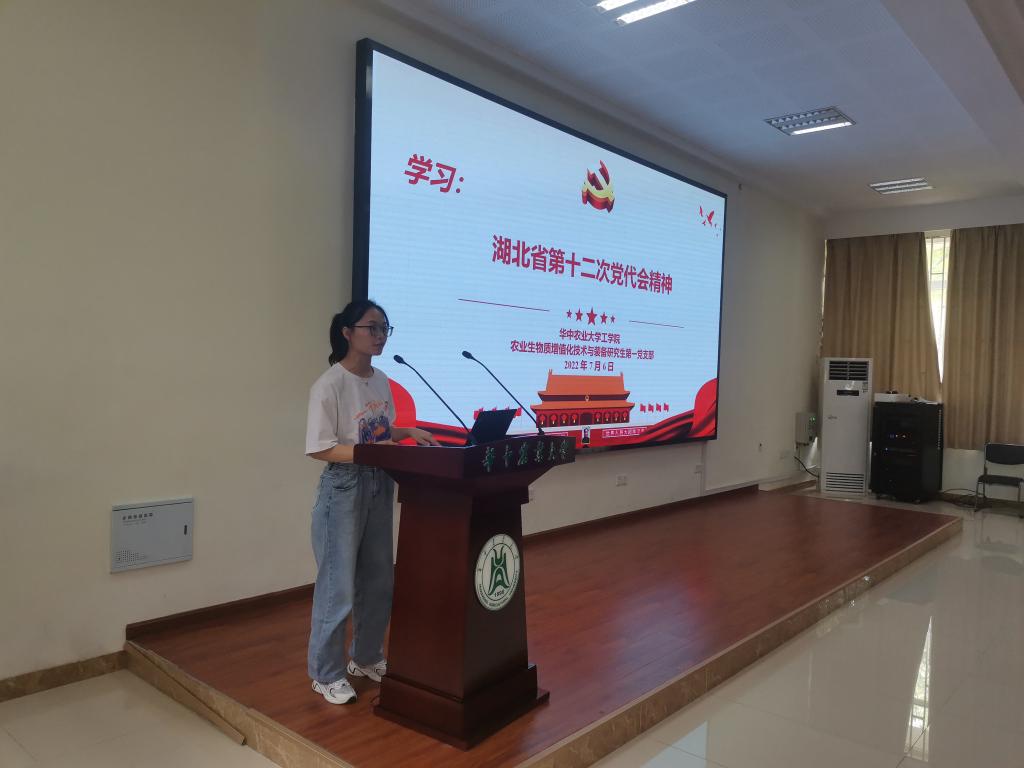 农业生物质增值化技术与装备研究生第一党支部副书记韦诗慧在领学湖北省第十二次党代会精神时,从会议背景、“过去五年怎么样”、“未来五年怎么干”三个板块进行阐述和讲解。她列举过去五年党的政治建设、疫情防控湖北保卫战等七大成就,并结合党的方针和政策指出未来五年我们要准确把握新发展阶段湖北面临的新形势新任务,努力构建新发展格局,完整准确全面贯彻新发展理念。