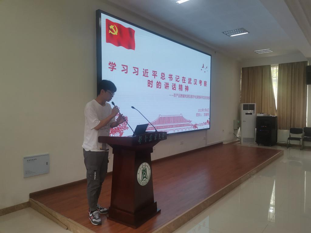 农产品智能检测及数字化装备研究生党支部书记刘瑜明在领学习近平总书记在武汉考察时的讲话精神时回顾习近平总书记在武汉新港阳逻集装箱港区“卷裤腿趟积水”调研、习近平总书记武汉烽火科技集团调研以及习近平总书记在抗击疫情的关键时刻专门赴武汉慰问当地人民的事迹,并向党员同志们表示,我们党始终与人民站在同一战线,持之以恒地为人民服务。同时他谈到,在武汉考察期间习近平总书记强调,我们必须完整、准确、全面贯彻新发展理念,深入实施创新驱动发展战略,把科技的命脉牢牢掌握在自己手中,在科技自立自强上取得更大进展,不断提升我国发展独立性、自主性、安全性,催生更多新技术新产业,开辟经济发展的新领域新赛道,形成国际竞争新优势。