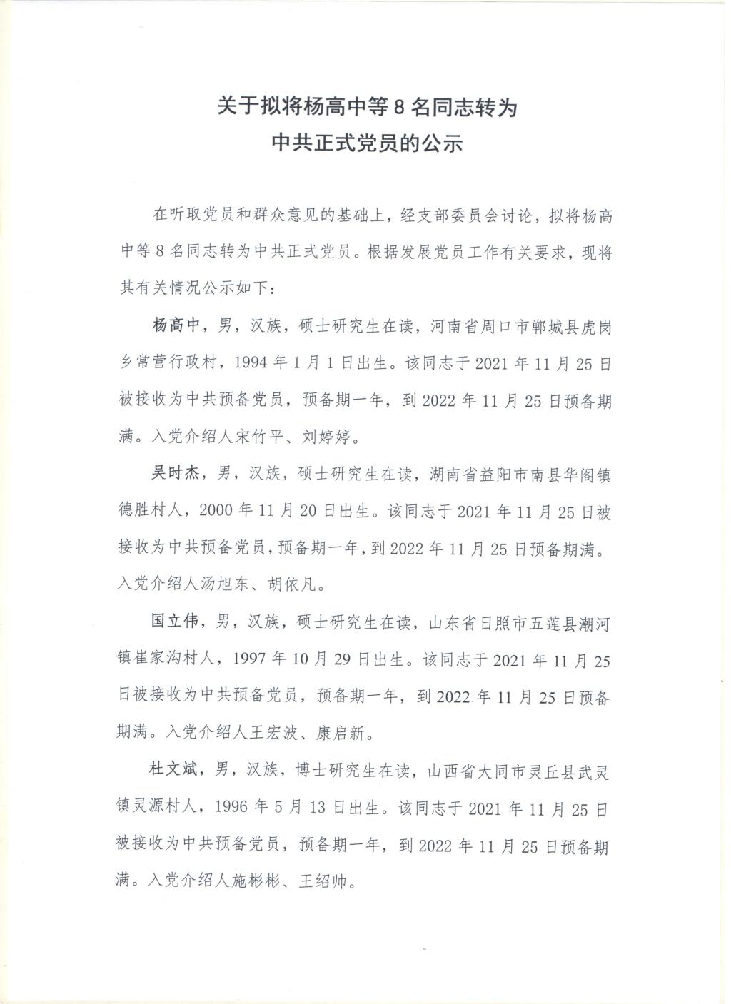 【研】关于拟将杨高中等8名同志转为中共正式党员的公示