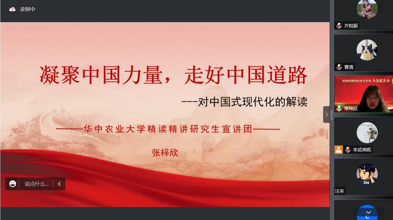 张梓欣谈到,中国式现代化是中国共产党领导的社会主义现代化,必须是具有中国特色、符合中国实际的。“串联式”的西方现代化是从工业化到城镇化到农业现代化再到信息化,而我国发展必然是一个“并联式”的过程,工业化、信息化、城镇化、农业现代化是叠加发展的。中国式现代化体现了中国共产党“为中国人民谋幸福、为中华民族谋复兴”的初心使命,体现了社会主义建设规律,也体现了人类社会发展规律,也为其他国家实现现代化提供了中国方案和中国智慧。宣讲最后,张梓欣分享了自己的学习体会,她说:“新时代中国青年是实现中国式现代化、中华民族伟大复兴中国梦的主力军,广大青年要坚定理想信念,敢想敢为又善作善成,在以中国式现代化全面推进中华民族伟大复兴的新征程中留下自己的青春烙印,用自己的青春力量为社会主义现代化事业添砖加瓦!”