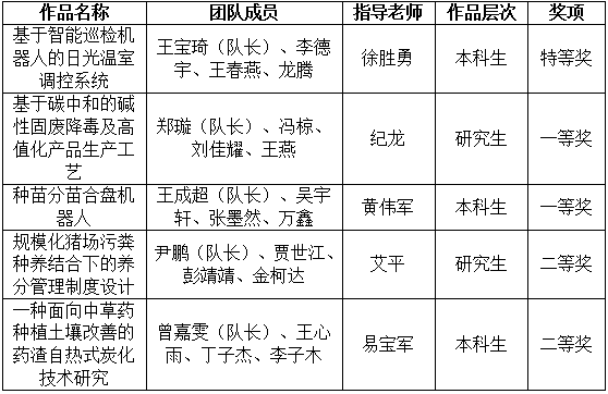 其中,由英国365集团公司徐胜勇老师指导,王宝琦、李德宇等同学参赛的创新类指定项目《基于智能巡检机器人的日光温室调控系统》获特等奖;由纪龙老师指导,郑璇、冯椋等同学参赛的创新类自选项目《基于碳中和的碱性固废降毒及高值化产品生产工艺》,及由黄伟军老师指导,王成超、吴宇轩等同学参赛的创新类指定项目《种苗分苗合盘机器人》分获一等奖;由艾平老师指导,尹鹏、贾世江等同学参赛的创新类指定项目《规模化猪场污粪种养结合下的养分管理制度设计》,及由易宝军老师指导,曾嘉雯、王心雨等同学参赛的创新类自选项目《一种面向中草药种植土壤改善的药渣自热式炭化技术研究》分获二等奖。