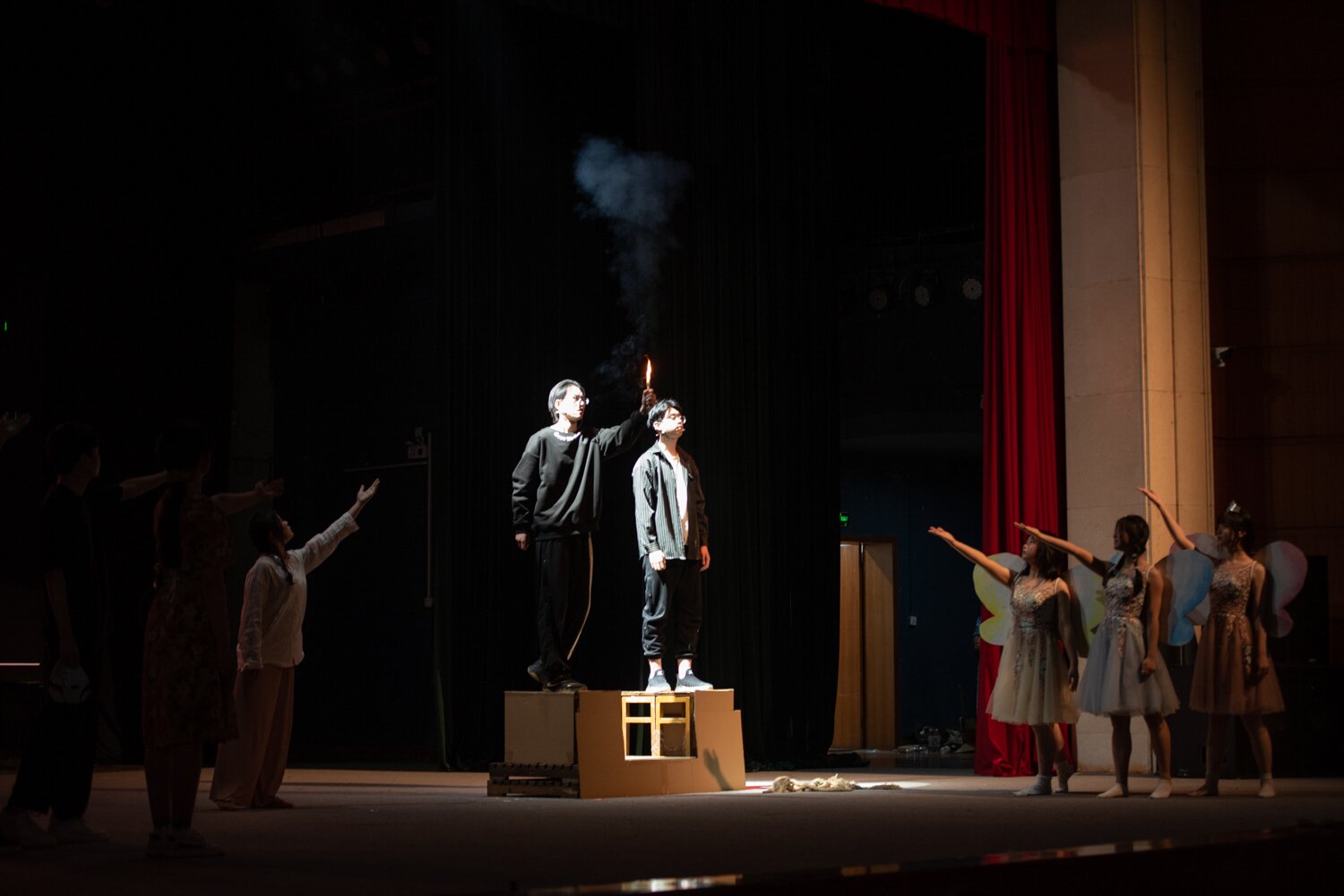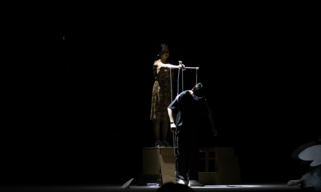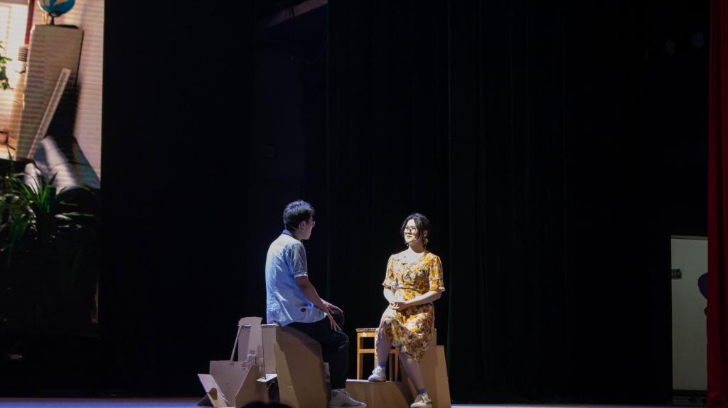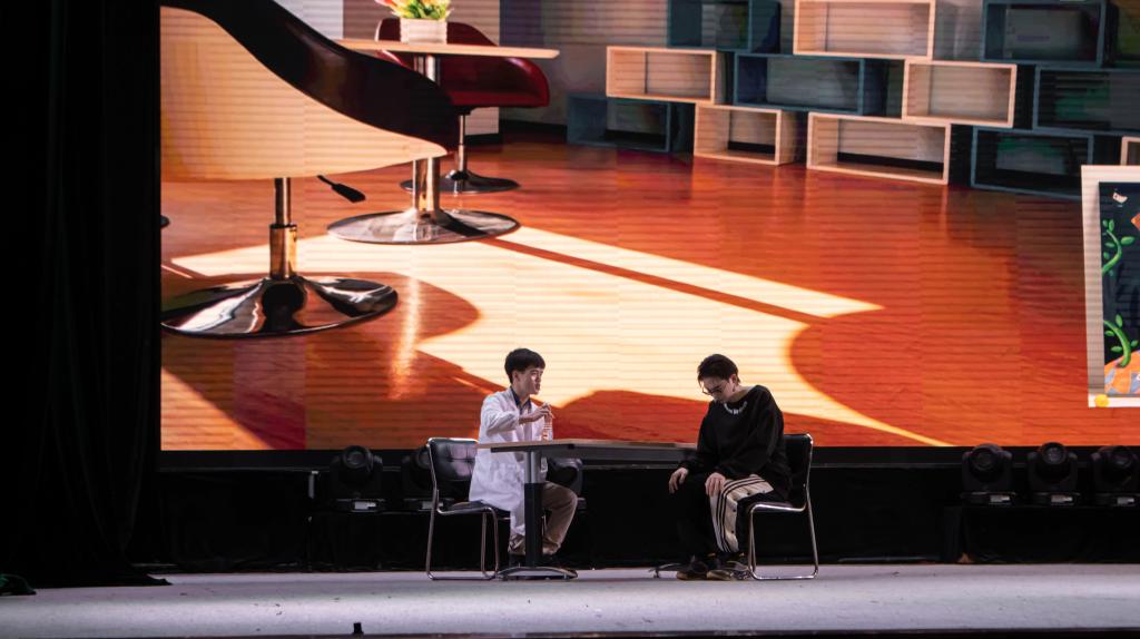 《燃烧的摩多》紧扣“内卷”主线,以误会开篇,运用角色扮演、替身、独白、附加现实等技术,同时融入舞蹈、朗诵等元素,向观众展现了一位被所谓“母爱”埋没的潇洒诗人的故事。剧中的主人公摩多被大学里内卷的漩涡裹挟着,直到遇到诗歌,他像飘零许久的树籽,终于落地生根。一次,摩多获得诗歌比赛一等奖,却被母亲误以为得了国家奖学金。纸里包不住火,母子间的分歧在误会的逐渐升级中终于爆发。“每个人都有追求理想的权利,不要被世俗鞭策着被迫向前走,只有你自己才能成为你的主人,只有你自己才能决定你梦想的高度……”内卷与诗歌的对望,是现实与理想的反差,摩多寄居在脆弱嶙峋的灵魂躯壳里,在人们的帮助下,学会听从内心的声音,与现实和解,勇敢追逐自己想要的生活。