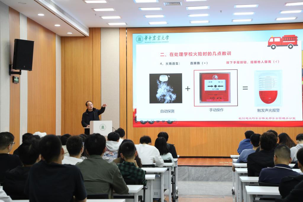 黄青松老师从“校园风险情况介绍”、“处理学校风险时的几点教训”、“常见火灾设备介绍”、“初期火灾处理”、“火场基本逃生知识”等五个方面为现场师生进行了消防安全知识培训,用惨痛的警示案例和现场视频直观地向师生展示实验室安全运行管理的极端重要性和科学的应急处理措施。