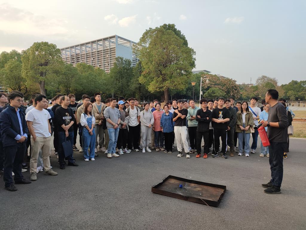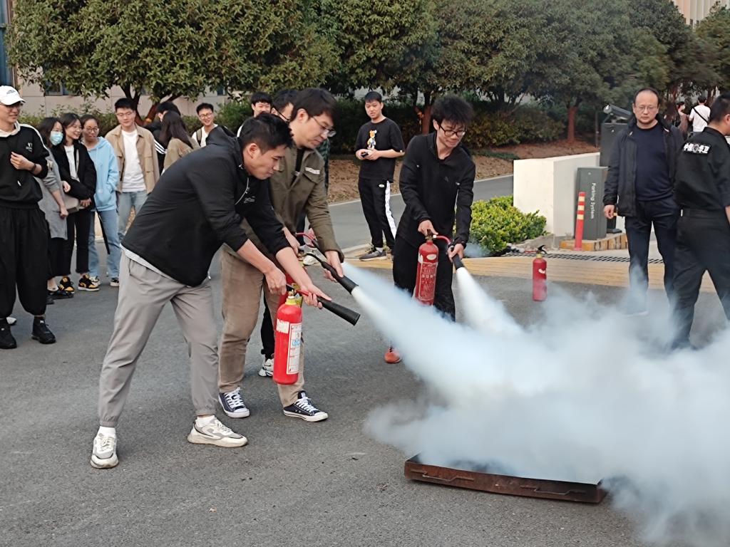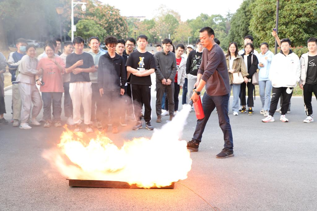 培训结束后,参会师生在新工科大楼旁进行消防安全现场演练。建安部负责人向师生介绍了灭火器的使用方法,并设置模拟“火场”,手把手指导师生进行“灭火”实战,学习掌握灭火技能。
