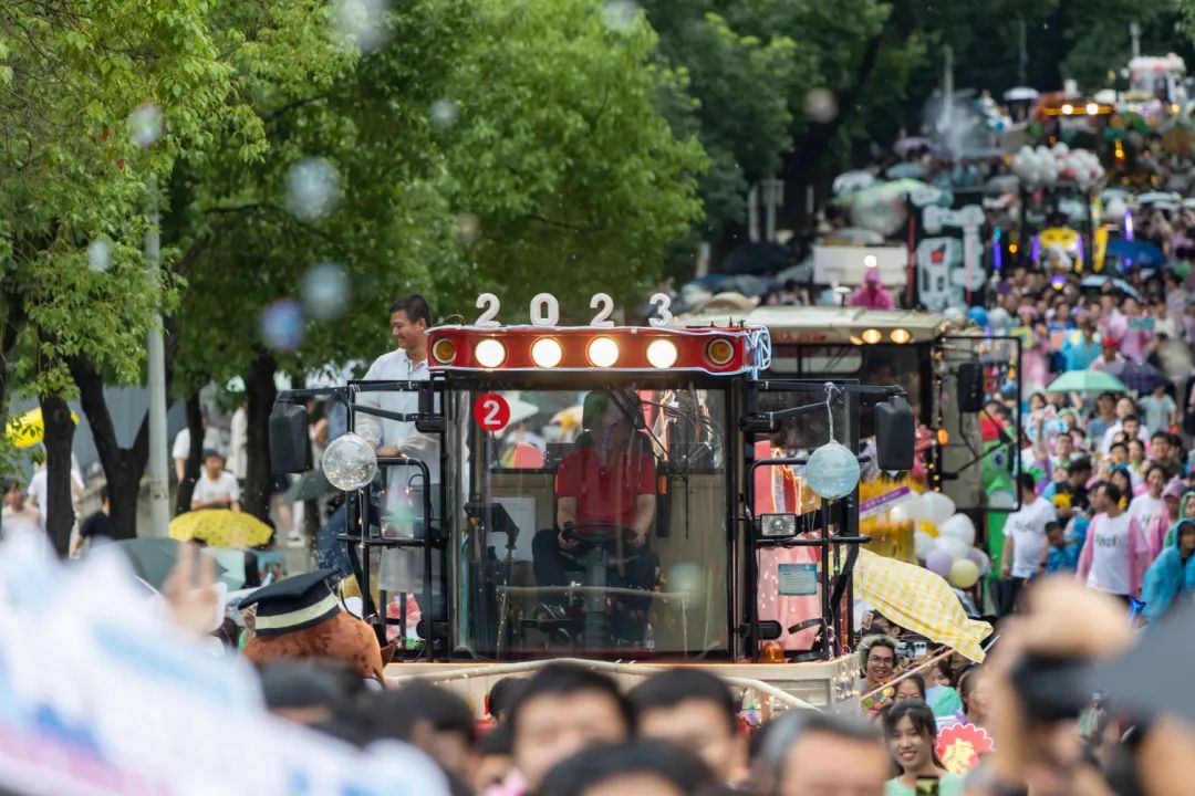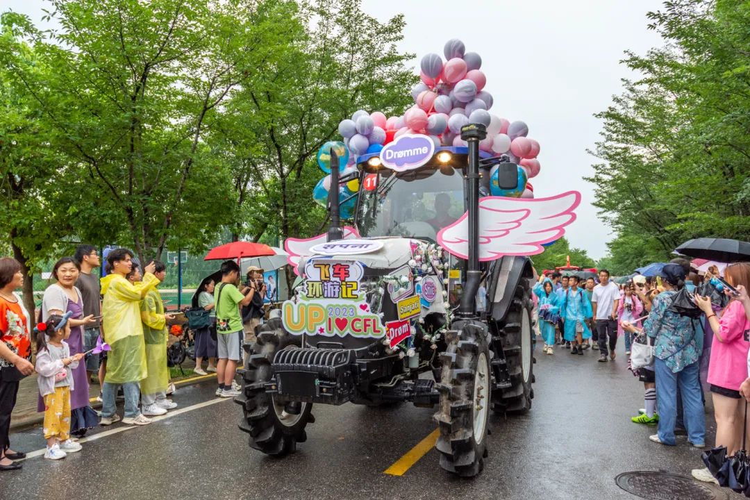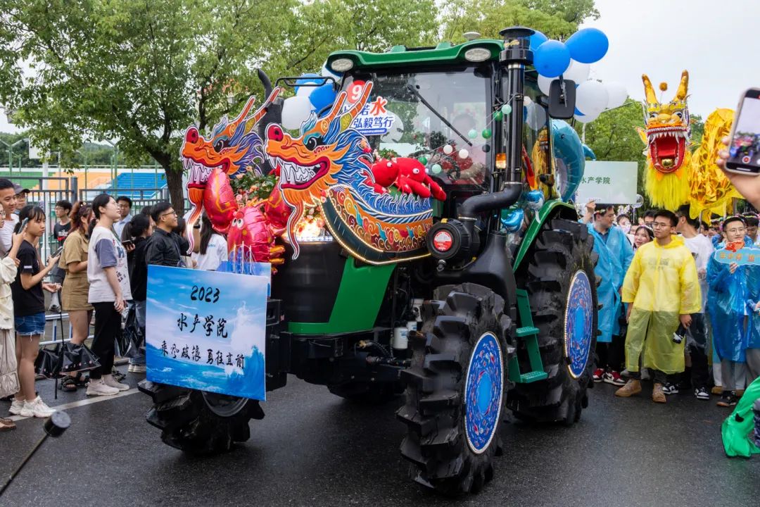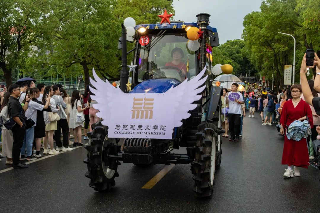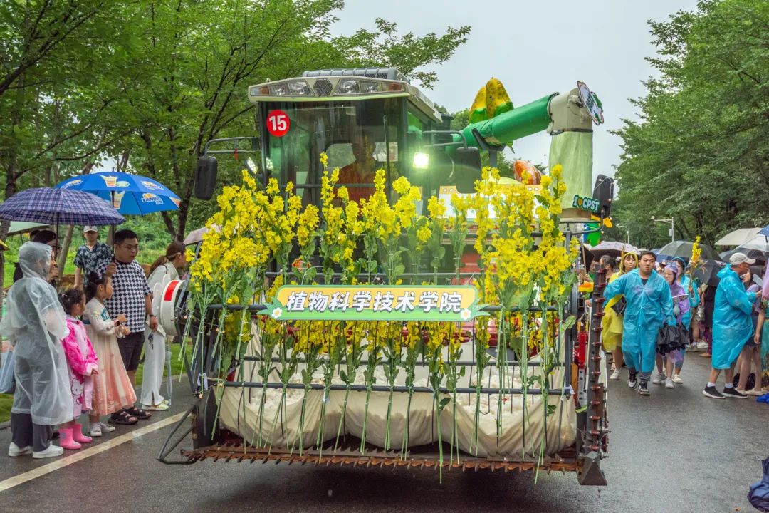 傍晚时分,雨花纷扬,蝉鸣阵阵,工科基地旁早已人山人海,由各学院精心装扮的15辆现代农机装备组成“钢铁长龙”阵列待发。伴随现场主持人的介绍,现场气氛逐渐被点燃。