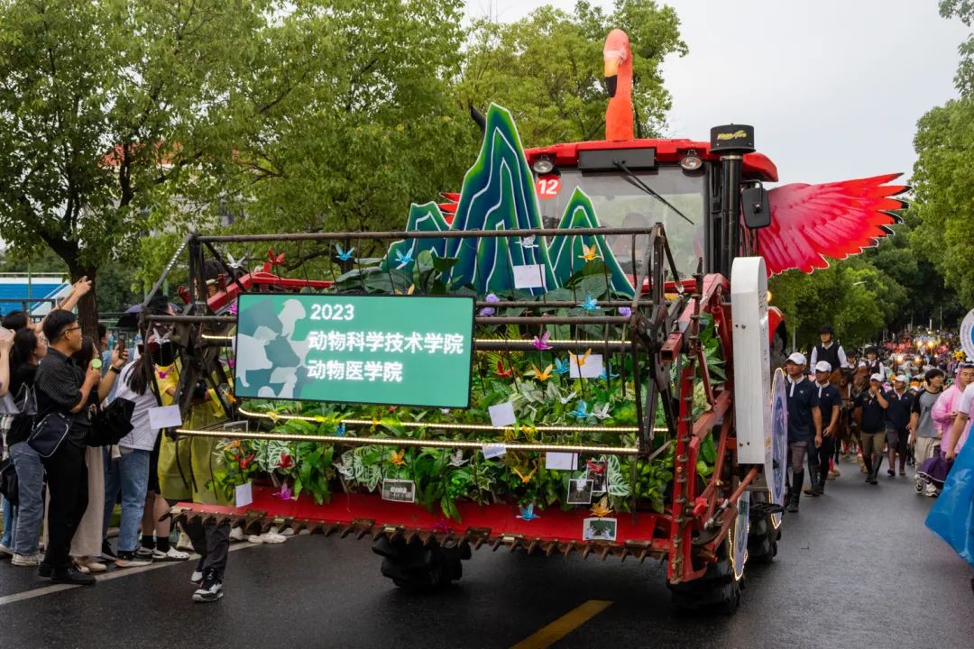 巡游队伍中,动物科学技术学院、动物医学院师生方阵格外惹人注目,9匹骏马由师生执缰骑行,彰显着动科动医学子“鲜衣怒马少年时”的蓬勃朝气,由我校自主研发的东方红割晒机车上,一只色彩鲜艳的火烈鸟振翅欲飞,以此祝福毕业生们永保内心的纯粹,坦途无畏、无惧风雨、追光逐梦!