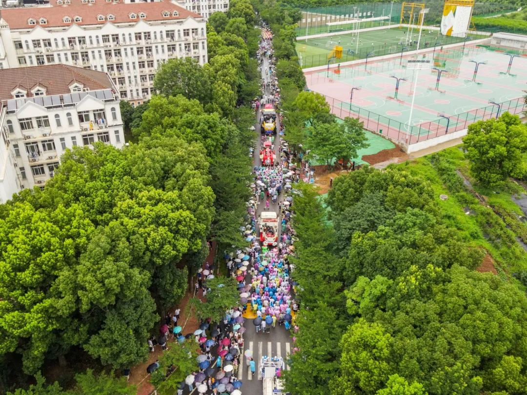 10头“醒狮”与4条“长龙”在巡游队伍前方舞动前行,伴随铿锵的鼓点,活泼可爱的小狮子们时而威猛凛凛,时而乖巧灵动;神态各异的金龙交织穿梭,时而“盘龙昂首”,时而“翻江倒海”,演绎出毕业生们以龙腾狮跃之姿自信迈步未来的风貌,渲染着端午的节日气氛。