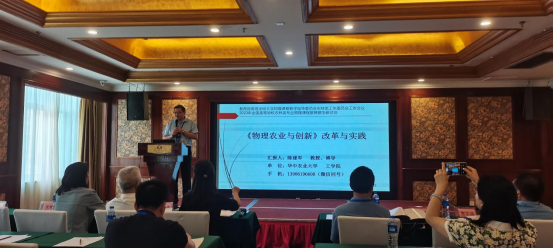 我院陈建军教授受邀在大会上作题为《物理农业与创新》改革与实践的报告,从课程背景、课程建设和成效三个层次,详细介绍了我校在农业问题导向下促进物理与农业交叉融合发展的尝试和创新,为当前农林类院校物理课程普遍存在的学生获得感不够高、与专业融合不够紧密等痛点和难点提供了行之有效的解决方案,得到了与会专家和代表的共鸣和好评。