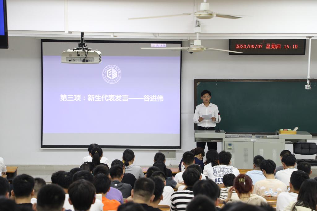 现代农业装备工程专业江善晨作为博士研究生新生代表发言。他回顾自己本科毕业工作一年后返校求学再到转博的心路历程。他以导师牛智有教授的教诲与新生共勉,一是“学习知识长本领”,要通过不断地自主学习和独立思考,达到从量变到质变的突破。二是“学习他人长能力”,在科研学习中要虚心向其他师生学习,取长补短,不断补齐短板。三是“反省自己长智慧”,要时常回头审视自己的科研内容和课题进度,不断总结反思,脚踏实地行稳致远。