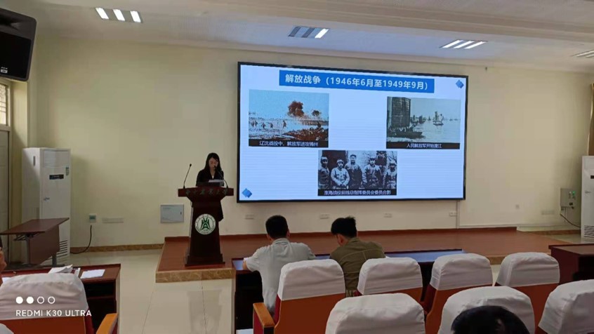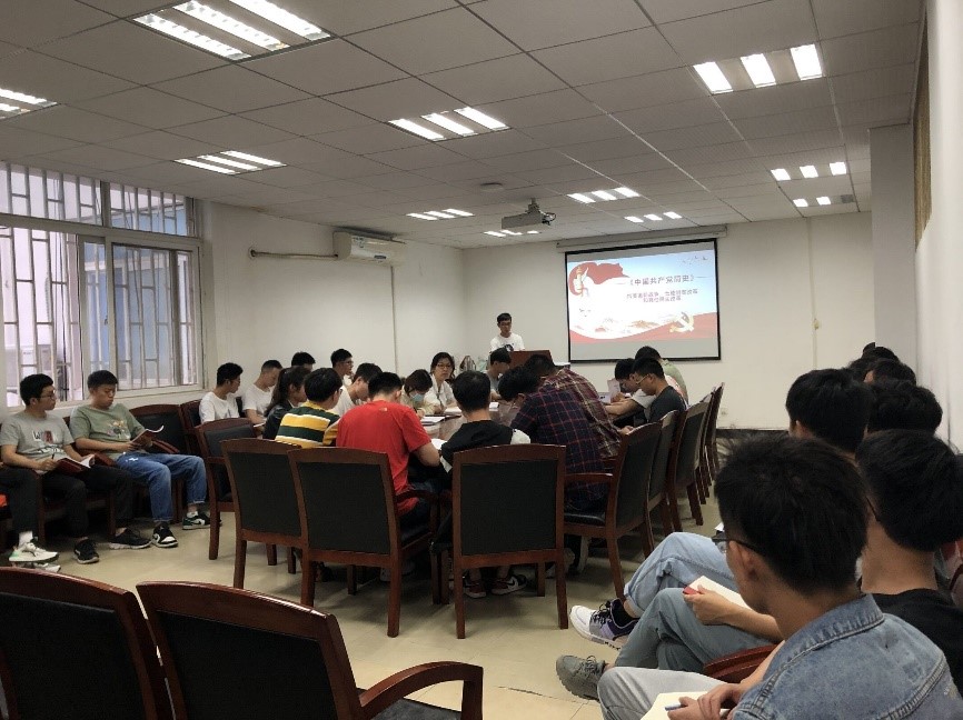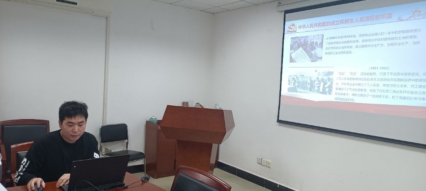 刘兴同志领学了《中国共产党简史》第五章,他从中华人民共和国的建立开始,先后讲述了抗美援朝、土地制度改革等社会主义道路的探索,带领大家深刻学习了我国社会主义建设的艰辛历程。他谈到,在党的带领下,我国在建国初期的探索虽经历了艰难,但切切实实地为新生的中国打下了坚实的基础。