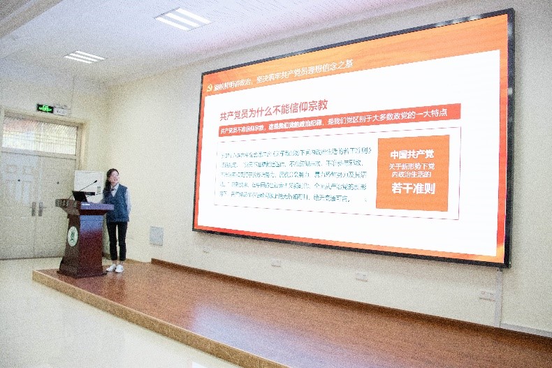 接下来,教师党员代表进行分享。谭鹤群同志围绕《学好党史、新中国史、改革开放史、社会主义发展史》、《在纪念五四运动一百周年大会上的讲话》,通过习近平主席的讲话,提出自己的感受。黄凰同志做题为“全面推进乡村振兴”的报告领学2021年中央一号文件,对历年中央一号文件重点内容和2021年中央一号文件中的亮点进行了解读。姚丁丁同志做关于“党员不信教”的主题报告,指出中共党员绝不能信教、坚决筑牢共产党员理想信念之基。