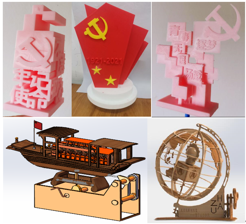 本次大赛旨在培养学生的创意创新意识、专业实践能力和团队合作精神,加强学生党史知识教育,厚植爱国主义情怀。学生灵活运用专业知识,将工学特色与党史学习相结合,充分展现创意创新设计、3D软件建模、3D打印实操技能等专业素质和能力。参赛作品依托红船精神、农业发展百年巨变、逐梦航天等题材,多维度展现中国共产党百年沧桑巨变以及当今中国的繁荣与富强,得到在场师生的一致认可与好评。