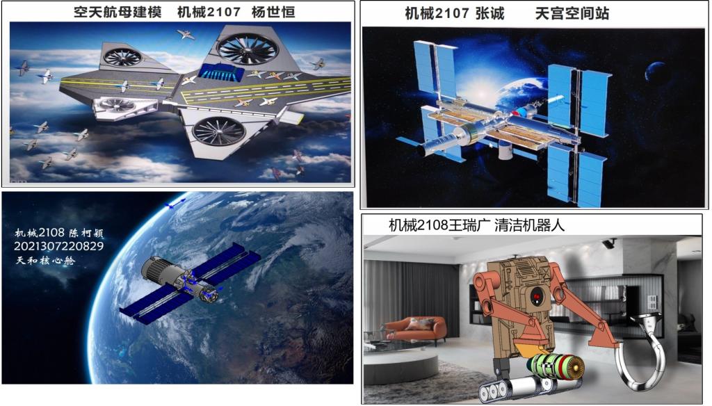 在课程结业汇报环节,机械2107-2108同学依次展示了《计算机绘图》三维模型结课汇报,这些模型内容涵盖了自行车、拖拉机、无人机、直升飞机、太空飞船、空间站、飞行器、清洁机器人等。